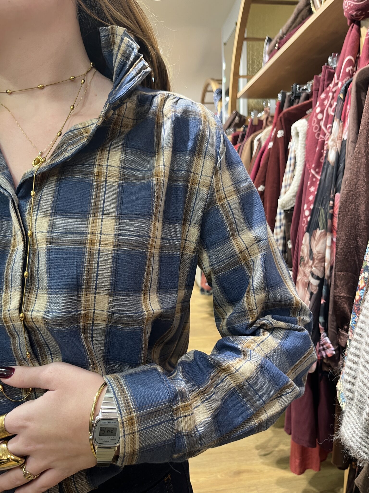 Blouse à carreaux bleu marine et chocolat