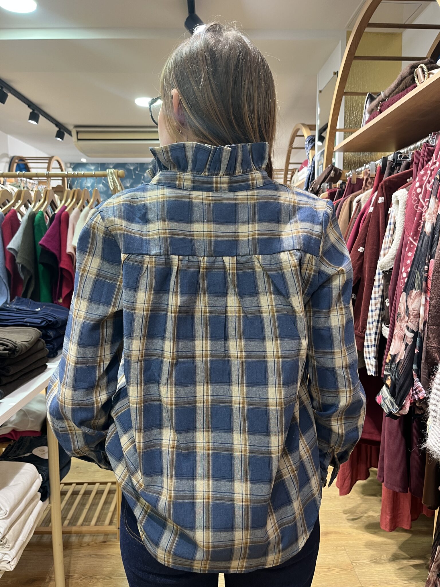Blouse à carreaux bleu jean col collerette