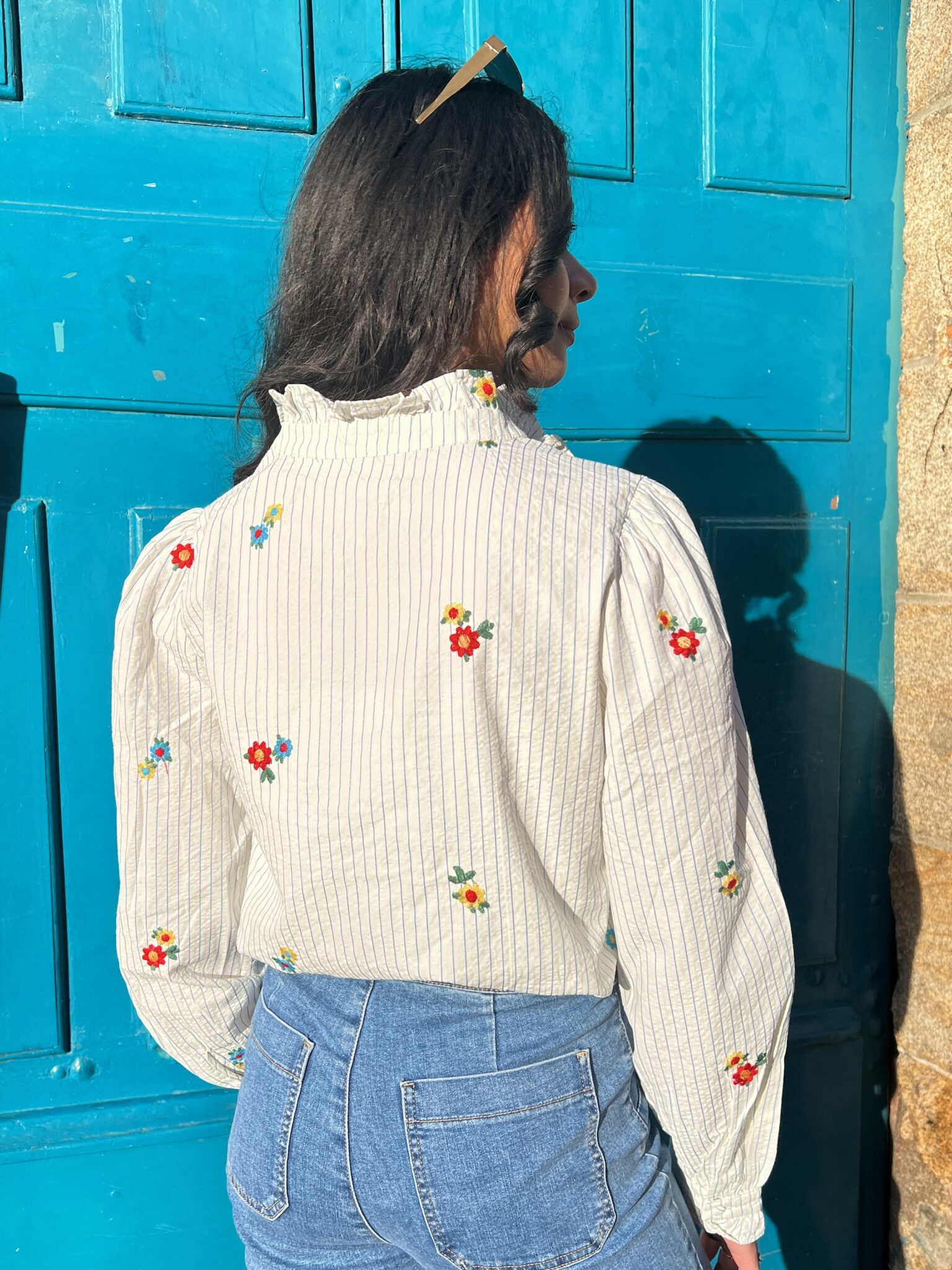 Blouse À Rayures Avec Broderies Florales Bleues