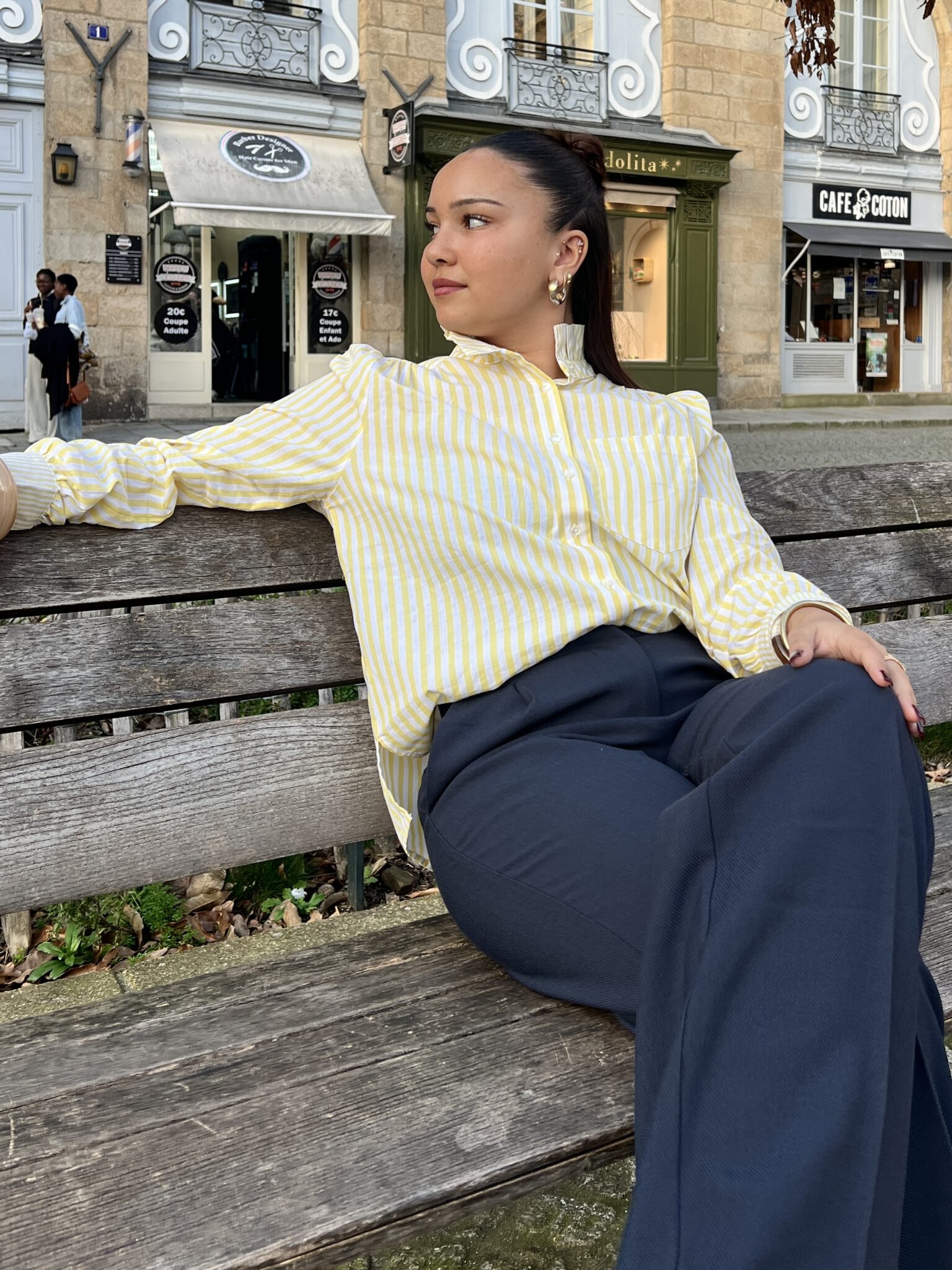 Blouse à rayures avec col collerette, à la fois élégante et facile à porter. Elle se marie parfaitement avec un jean pour un look casual ou avec un pantalon de costume pour une tenue plus chic et raffinée.