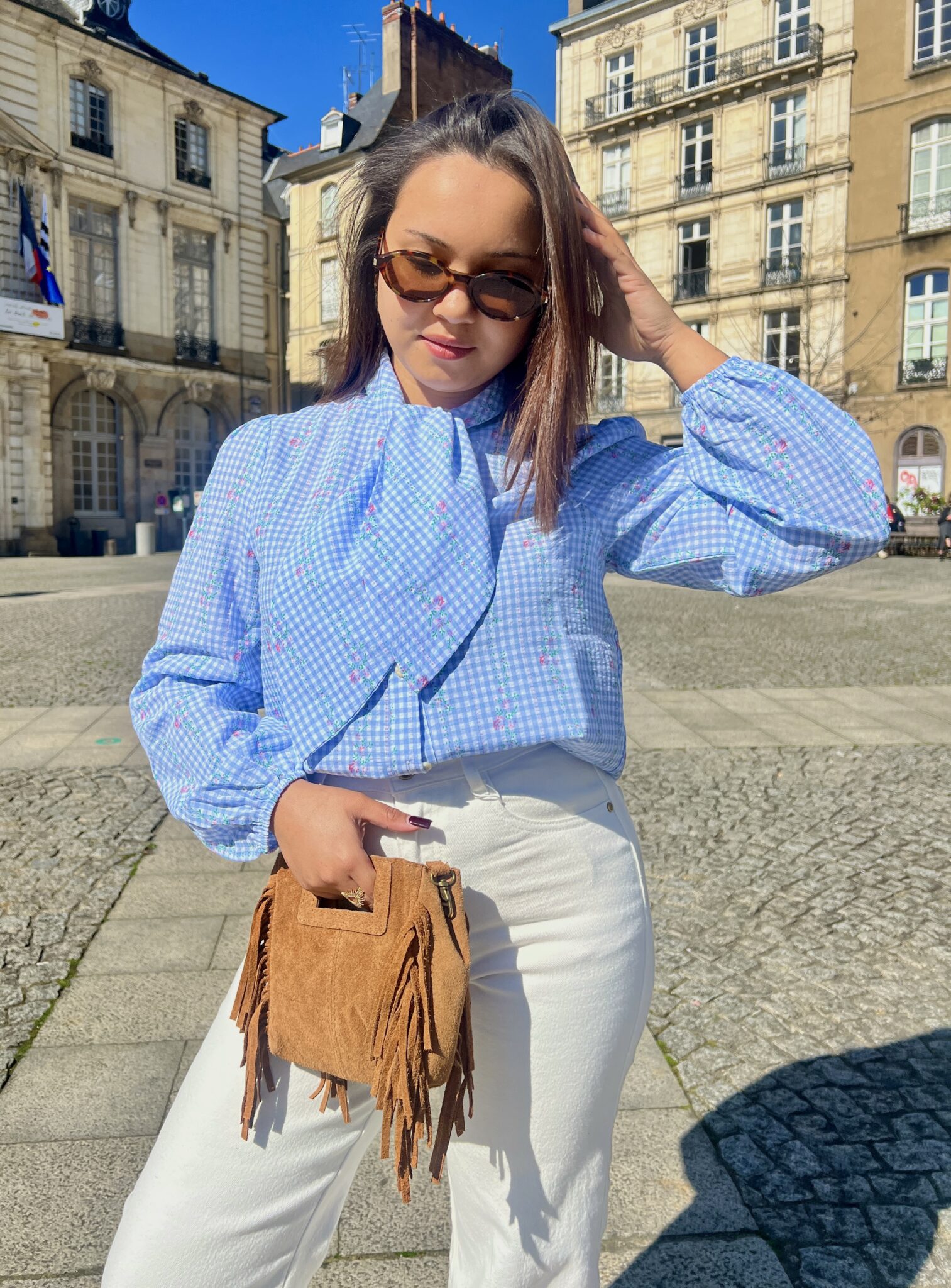 Blouse bleue avec détail cravate au col, mêlant imprimés liberty et vichy pour un style original et raffiné. Une pièce élégante qui apporte une touche de caractère à vos tenues.