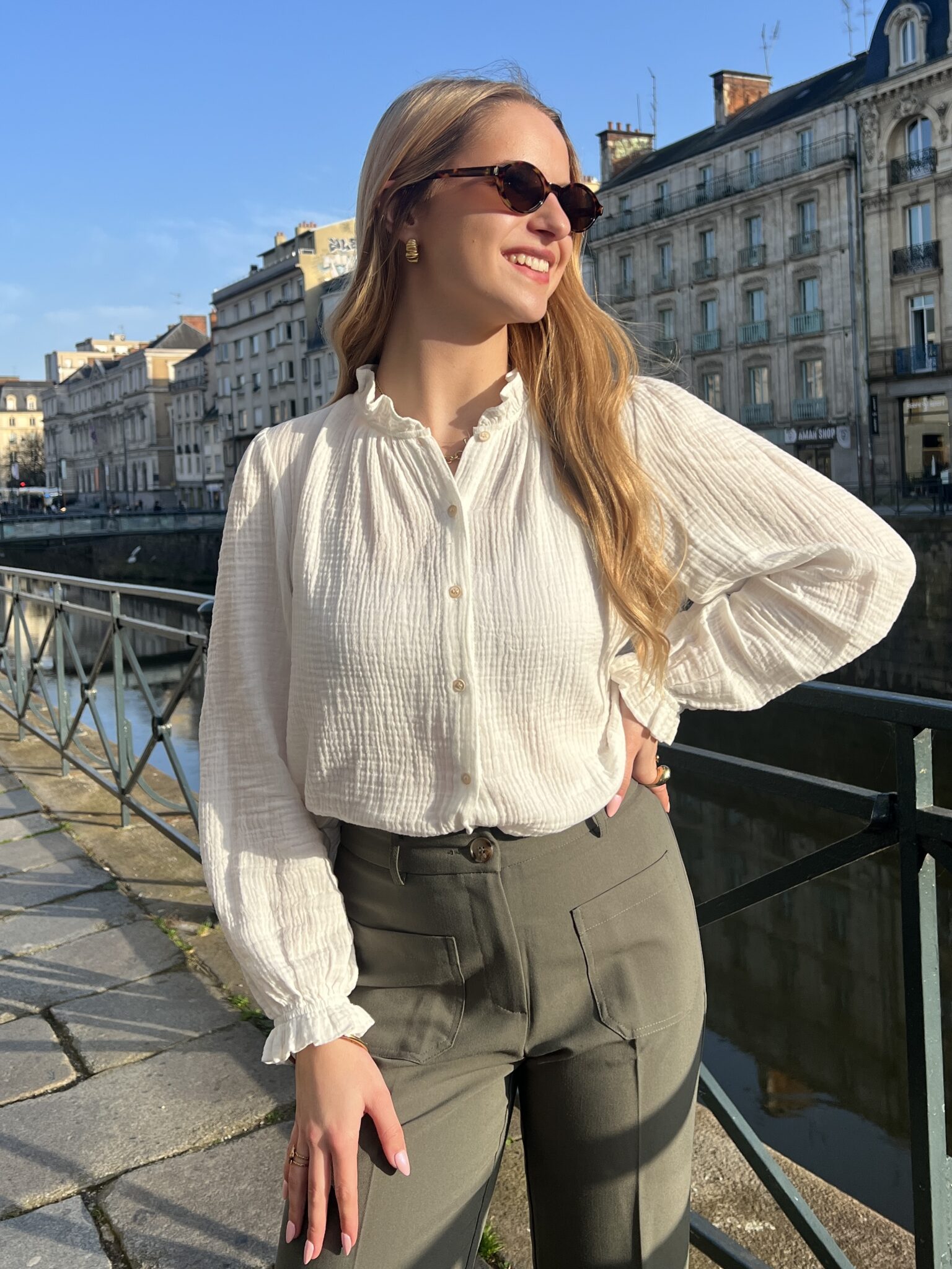 Blouse en gaze de coton blanc, une matière agréable et douce. Parfaite pour vos looks quotidiens, qui s’accorde à merveille avec nos pulls et gilets sans manches.