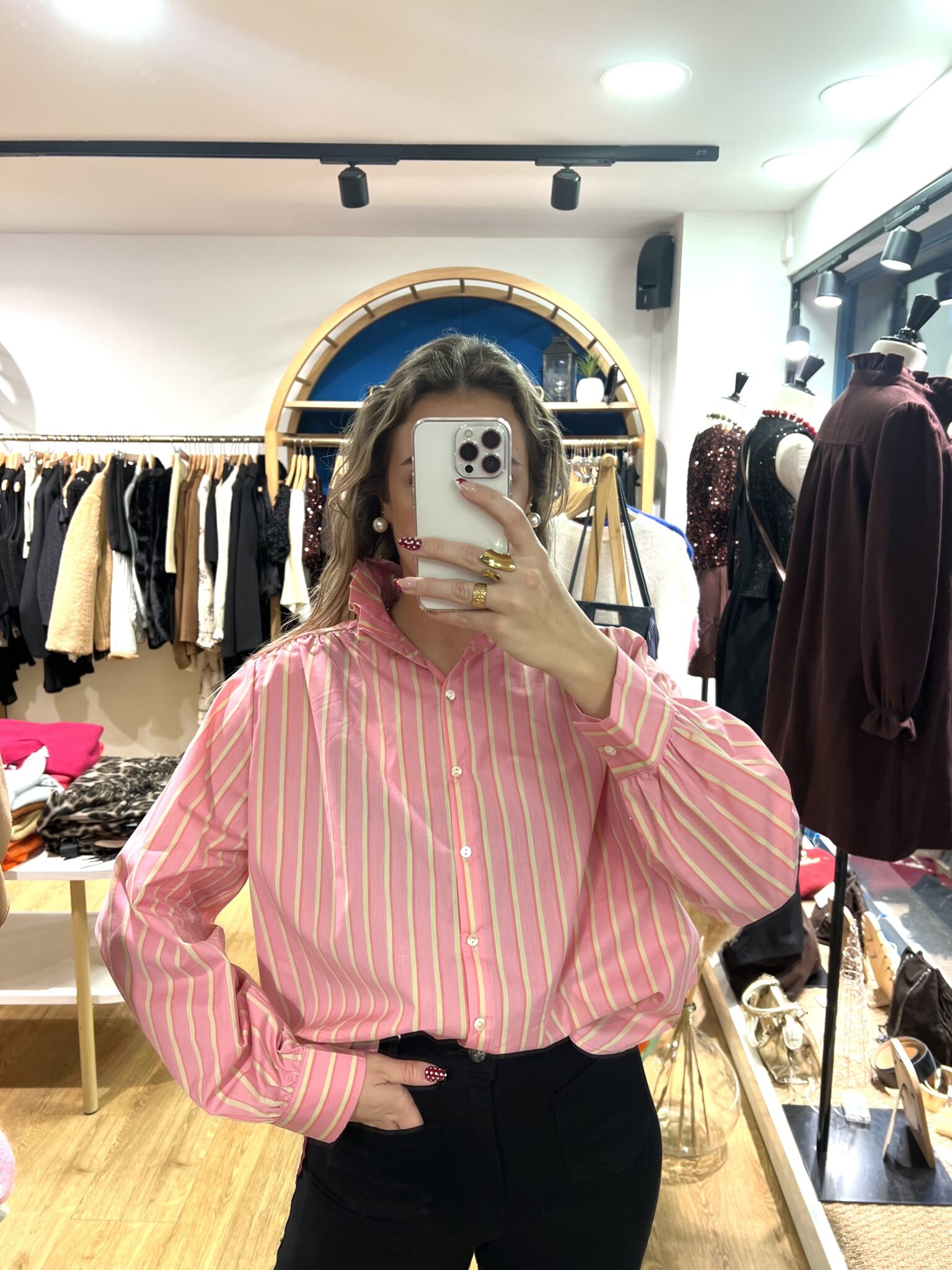 Cette chemise rose à rayures jaunes allie délicatement féminité et élégance. Son col à collerette apporte une touche romantique et raffinée, idéale pour sublimer une tenue aussi bien décontractée que chic.