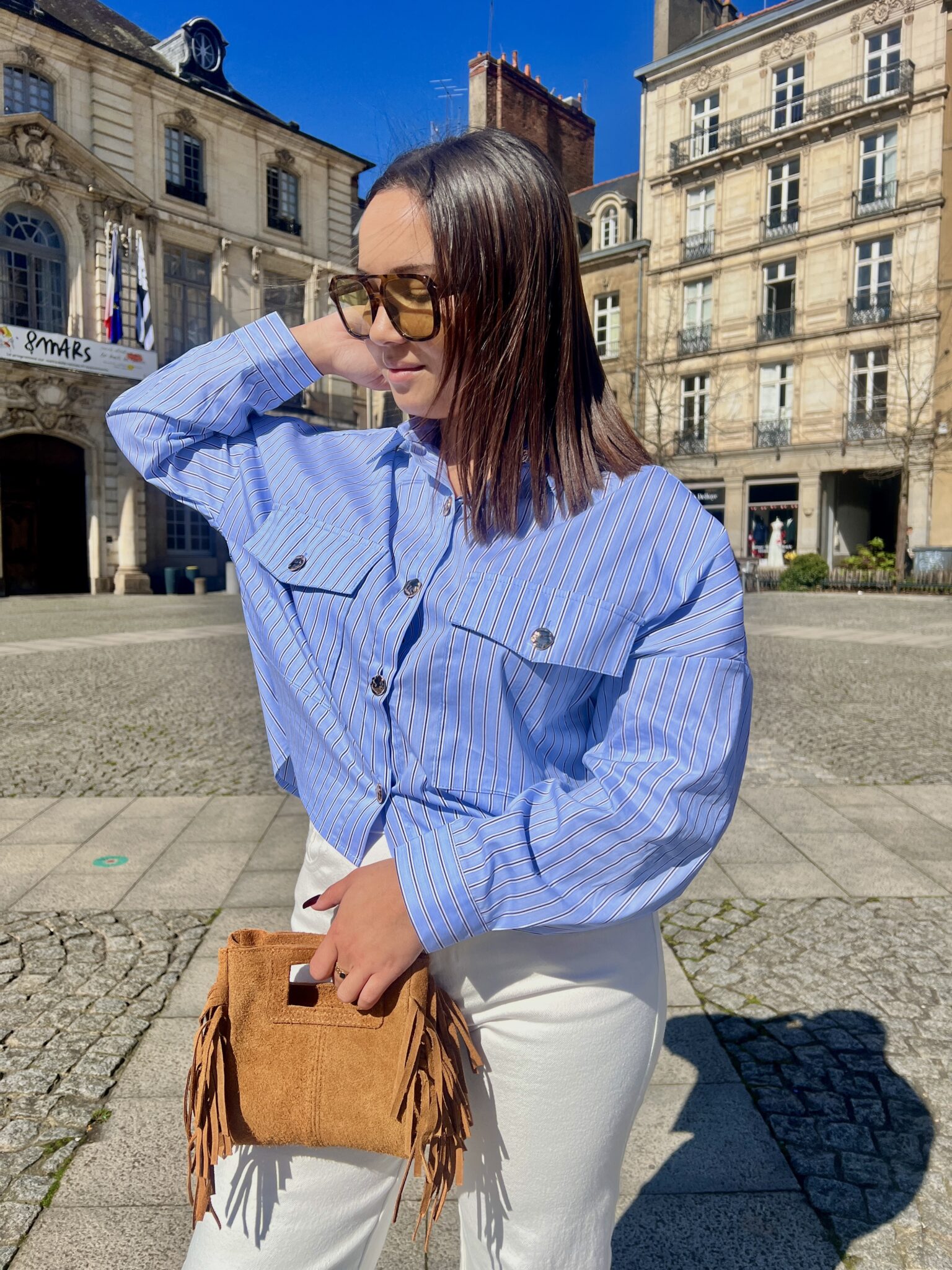 Chemisier bleu à rayures, sublimé par des boutons dorés et des détails de poches à l’avant. Une pièce élégante et structurée, idéale pour un look chic au quotidien.