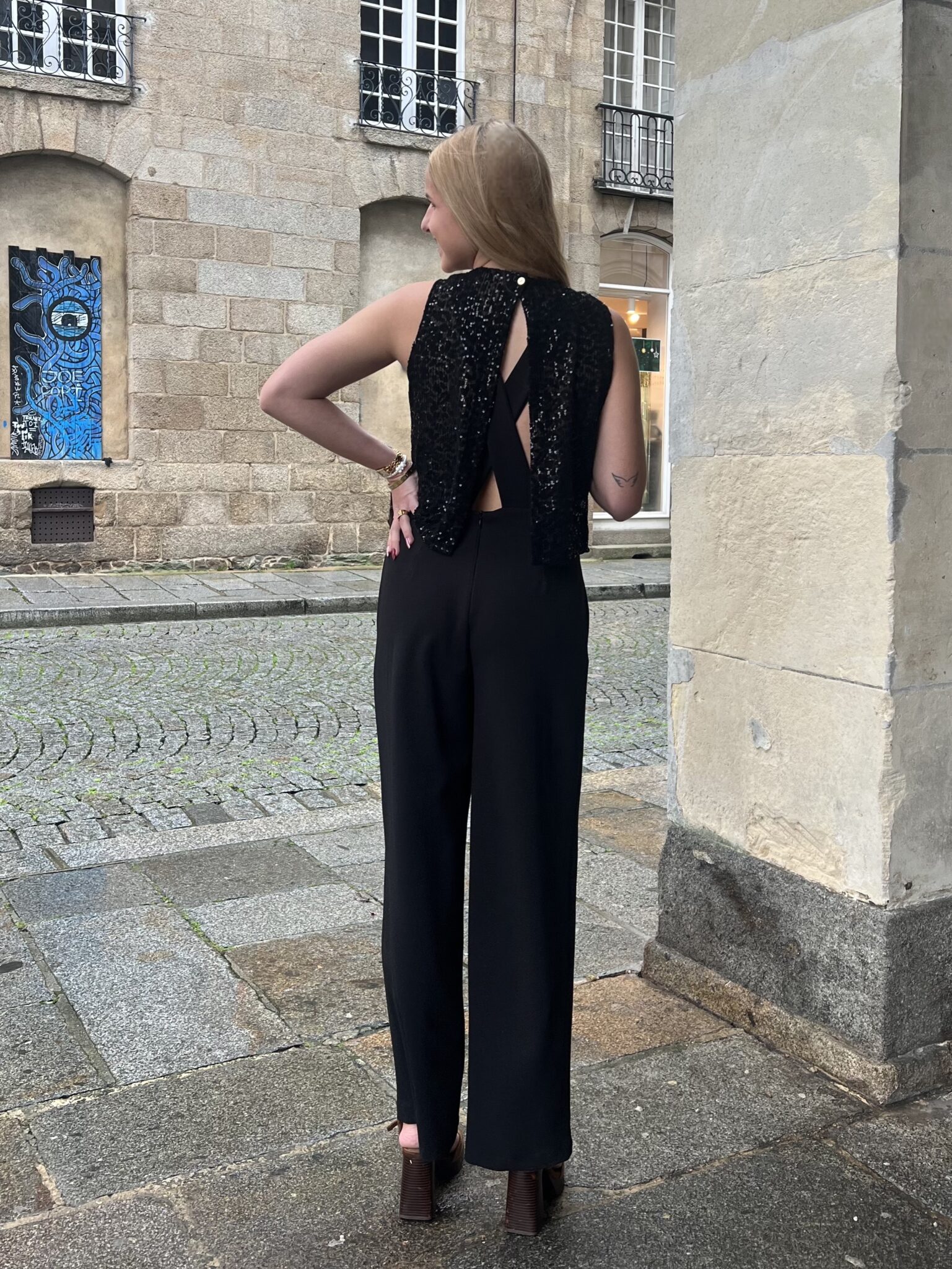 Une combinaison noire sequin à motif léopard discret très chic, idéale avec des escarpins noirs. Un look parfait pour les fêtes comme pour les soirées.