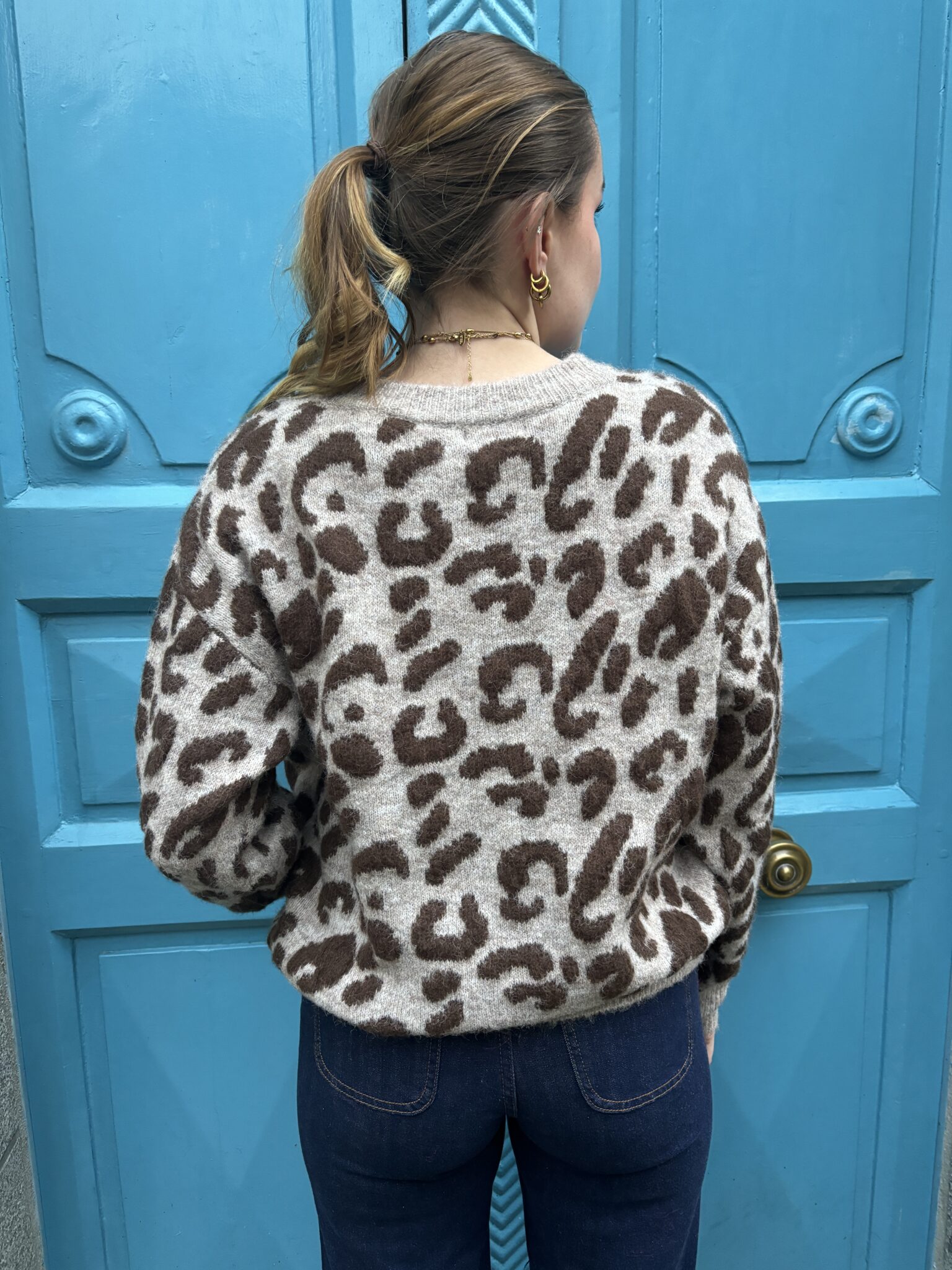 Gilet léopard chocolat, doux et chaud, avec un jean brut ou noir, idéal pour un look casual et décontracté.
