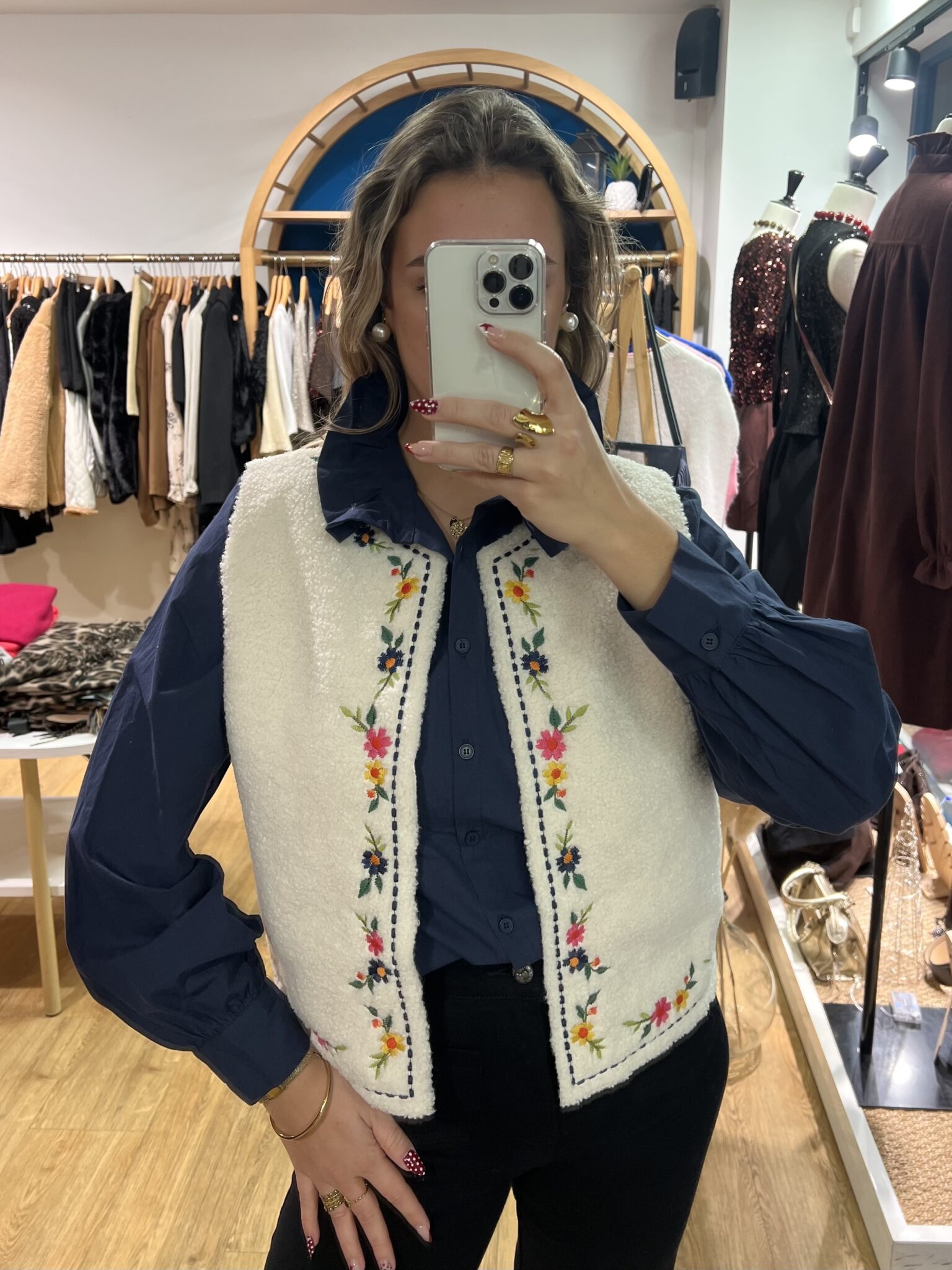 Gilet sans manche à détail floral qui ajoute une touche chaleureuse et élégante à votre tenue, idéal pour donner du style à un look simple et soigné.