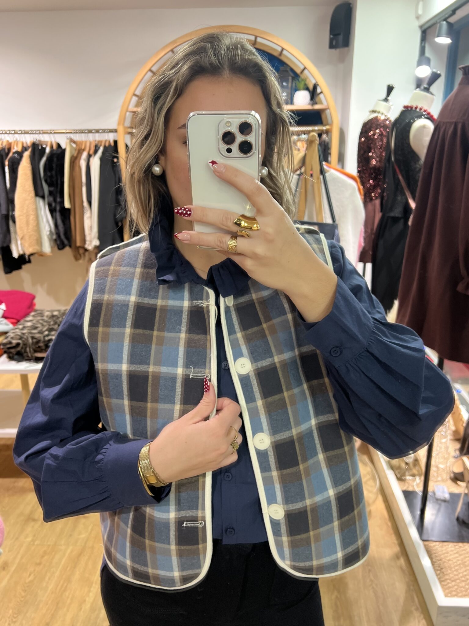 Blouse à carreaux bleu marine col collerette