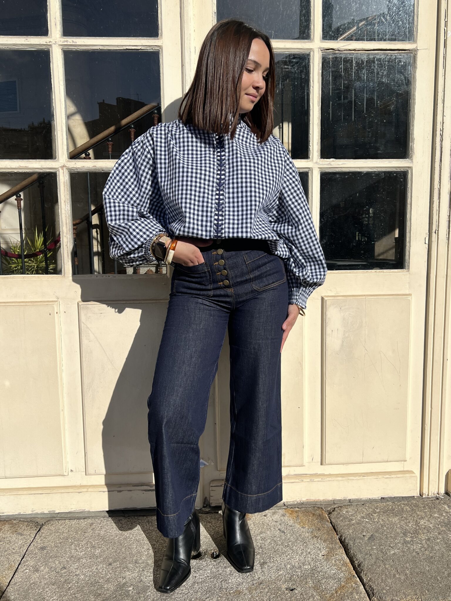Jean bleu brut au style intemporel, doté d’une ligne de boutons et un détail de poche sur devant. Idéale pour les petite silhouettes