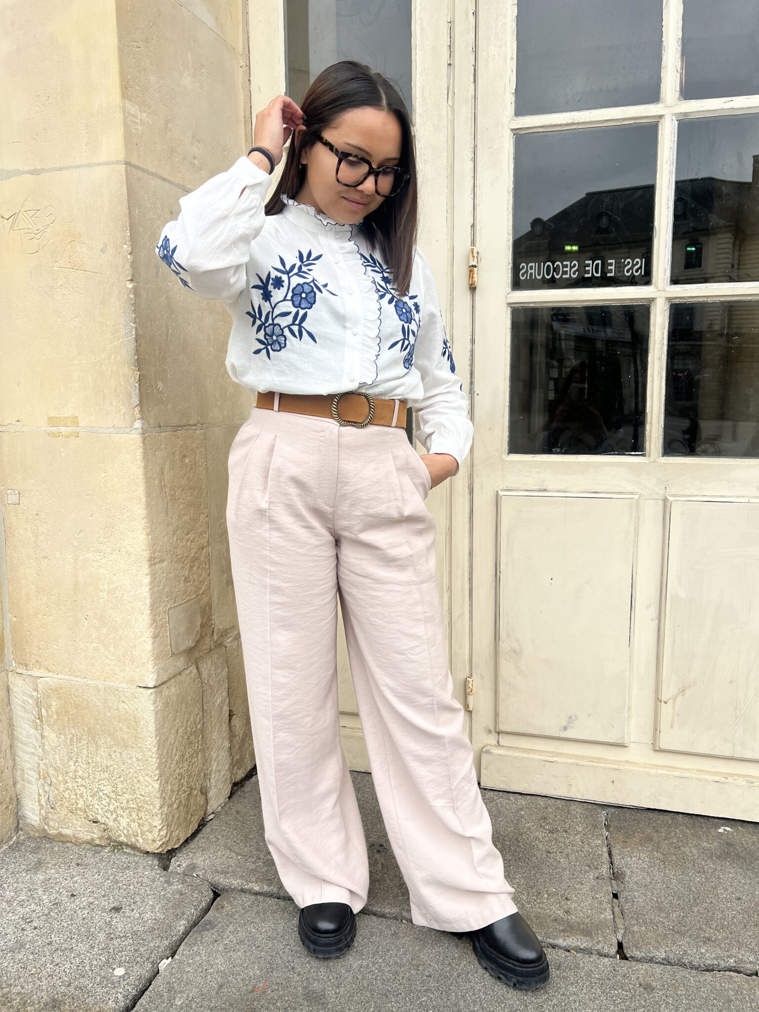Pantalon droit rose poudré avec poches, très classe et élégant, parfait pour la saison printemps. Sa coupe droite apporte une silhouette chic et intemporelle tout en restant confortable.