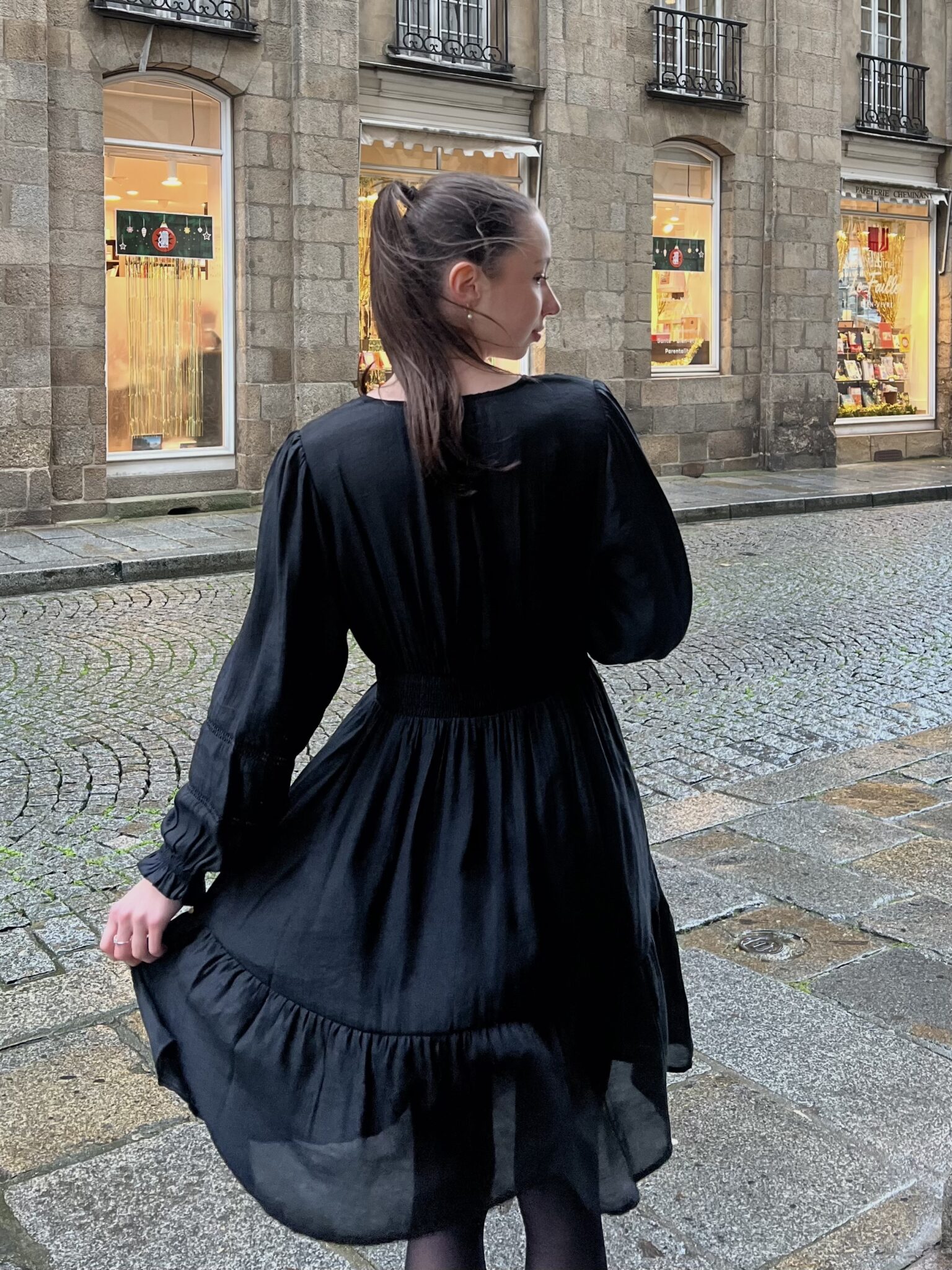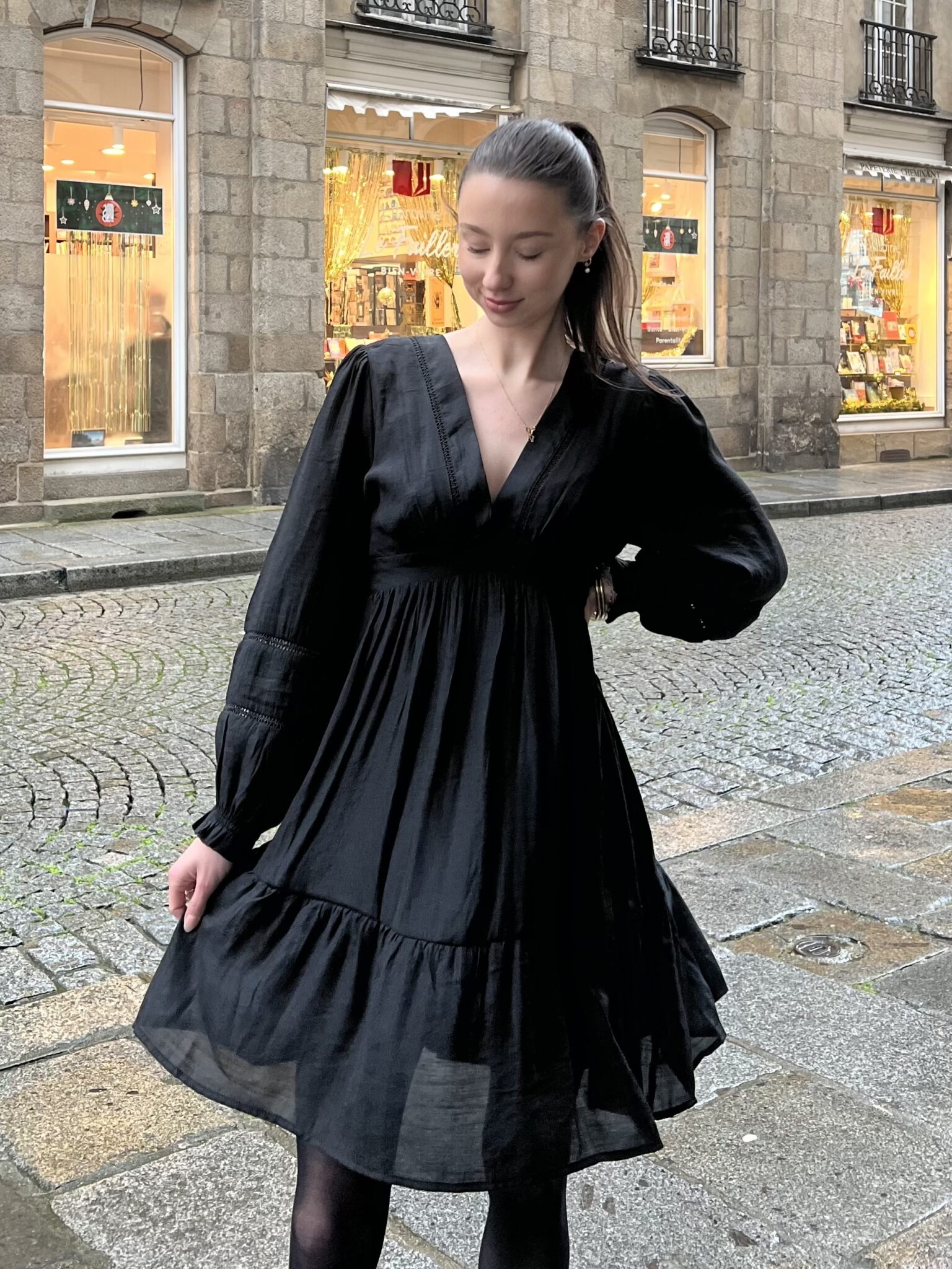 Féminine et élégante, cette robe courte noire met en valeur la silhouette avec son décolleté en V, sa taille marquée et ses manches longues légèrement bouffantes.
