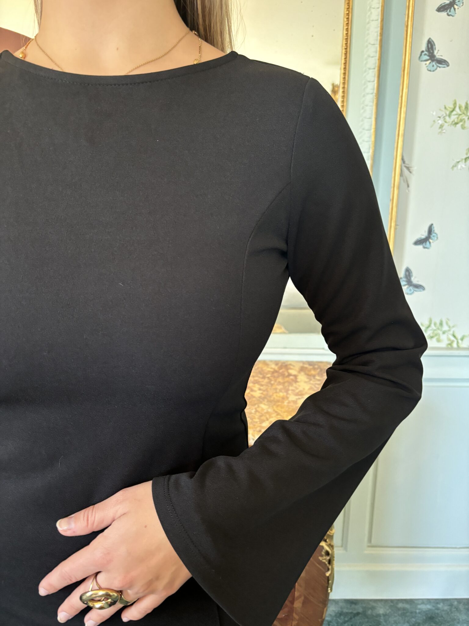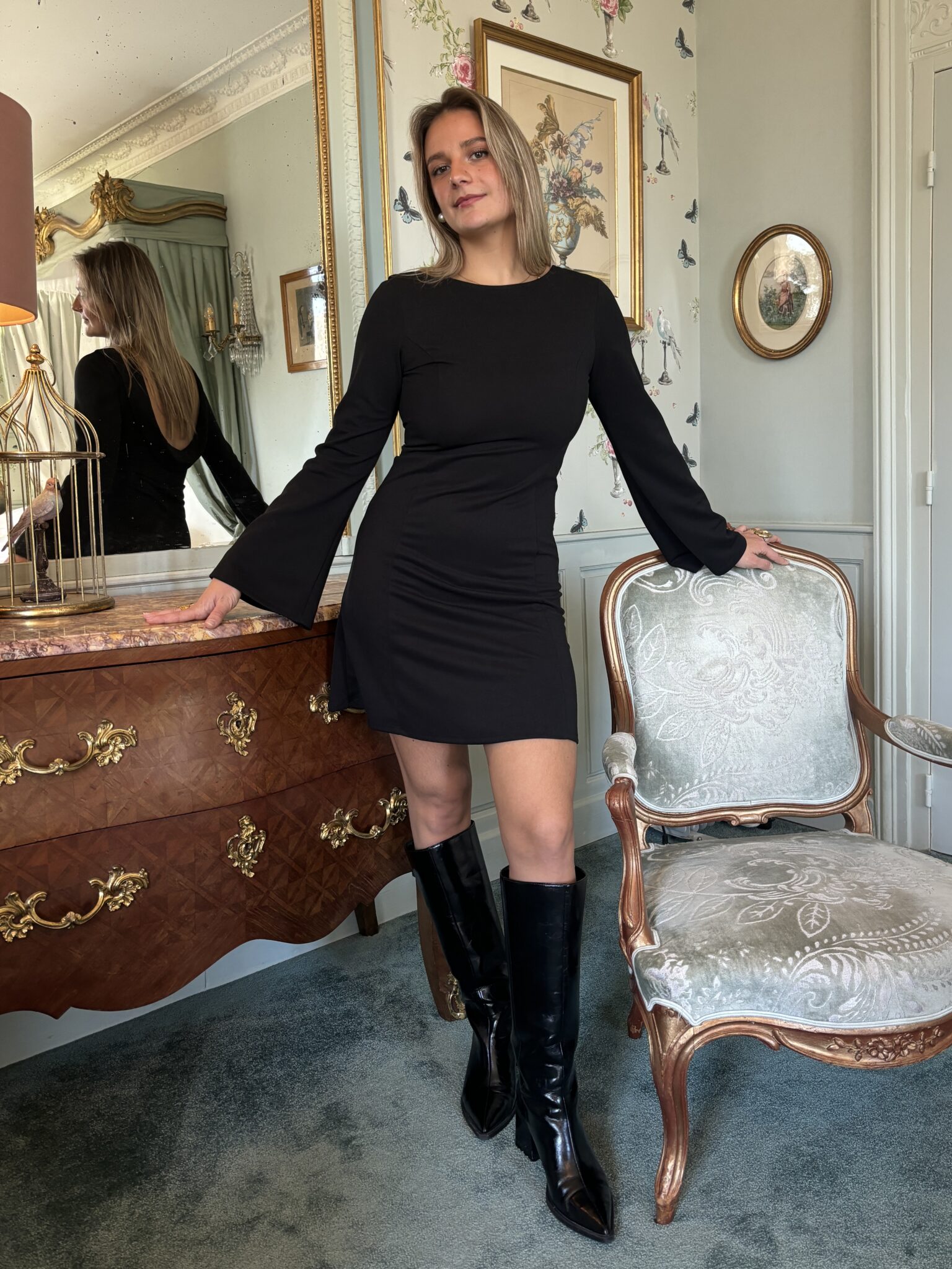 Élégante et sobre, cette robe noire dos nu sublime la silhouette. Elle s’allonge délicatement et dévoile désormais un beau décolleté dans le dos, magnifié par un joli nœud qui vient apporter une touche de finesse et de féminité.