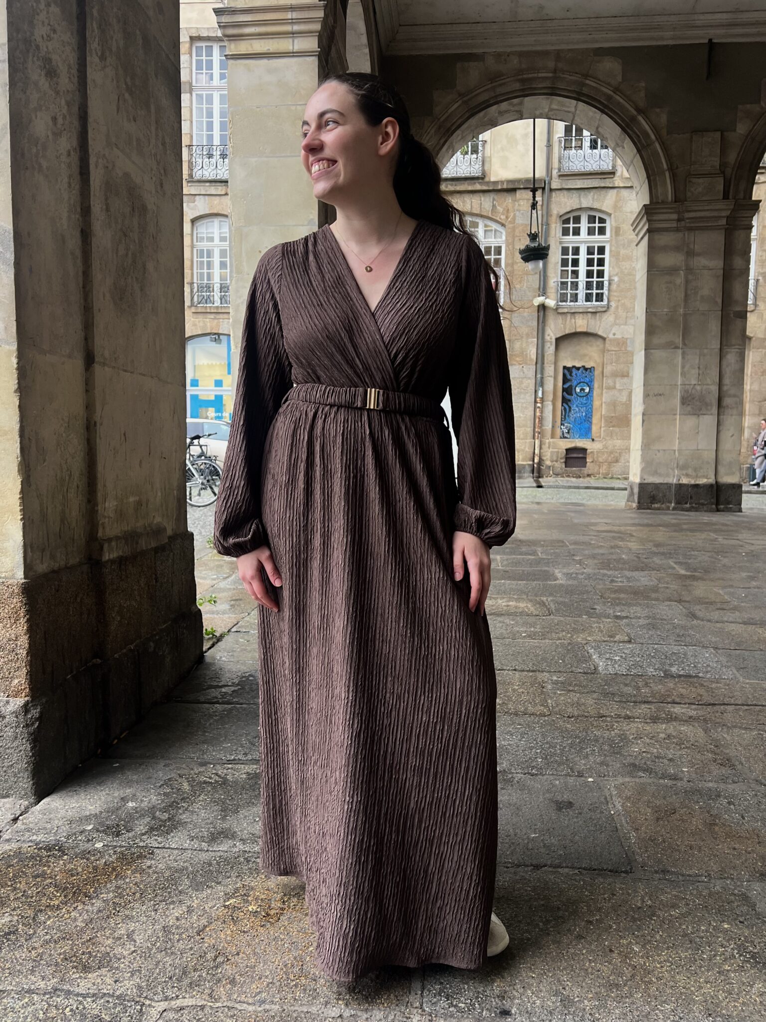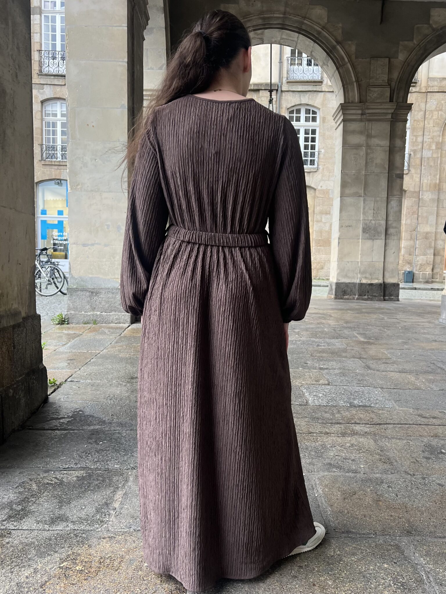 Élégante et féminine, cette robe longue avec ceinture chocolat met en valeur la silhouette grâce à sa ceinture qui marque la taille et sa coupe fluide. Une pièce chic et intemporelle, facile à porter.
